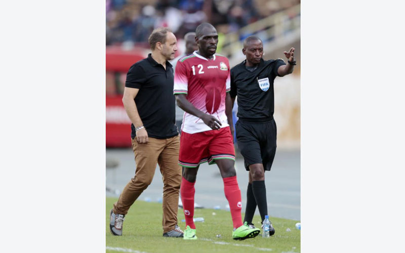 Harambee Stars' Joash Onyango is escorted by his coach Sebastian Migne after being red-carded during their Africa Cup of Nations qualifier against Ghana Black Stars at Moi International Sports Centre Kasarani Stadium on September 8, 2018. [Boniface Okendo, Standard]