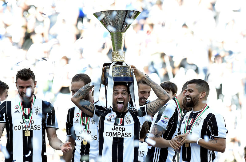 21/5/17 Juventus’ Dani Alves celebrates with the trophy on his head/Reuters