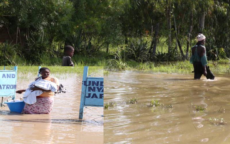 A flooded home at Songorota village in Nyakach, Kisumu County. More than 300 families have been displaced by floods. Inset: Pamela Awuor wades through flood waters with her baby and bucket. [Collins Oduor, Standard]