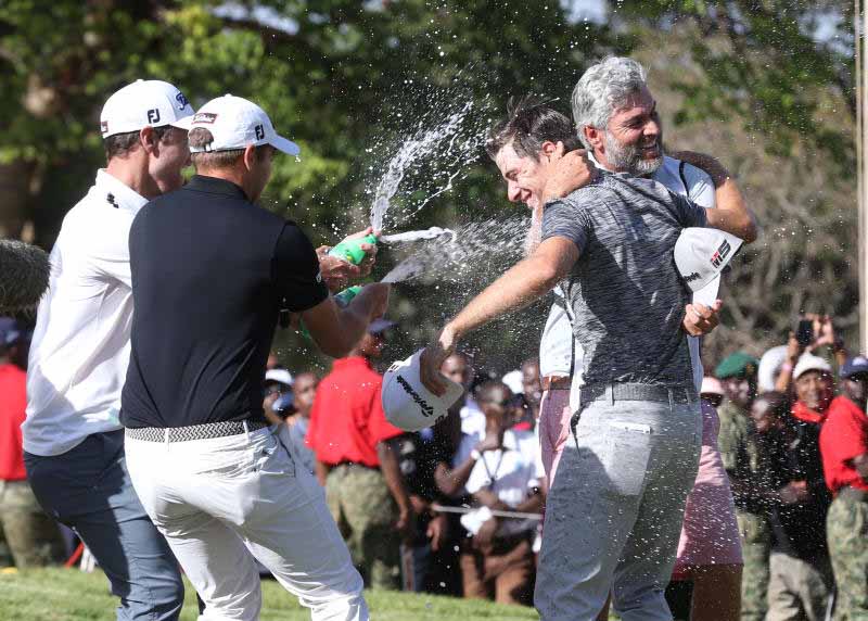 Italian Guido Migiliozzi is sprinkled with champagne after he emerged this year's Magical Kenya Open Golf tournament winner at the Karen County club on 17th March, 2019. [Picture; Stafford Ondego]