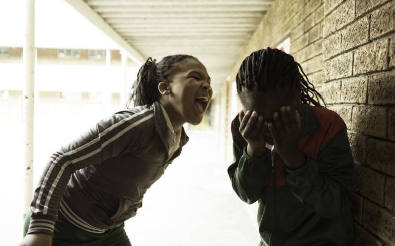 A school girl bullies another girl in a secluded passageway outside a school building.[Getty Images]