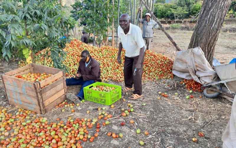 Members of Mwana Horticulture group sort out and pack tomatoes into crates ready for the market at their farm located in Kisau, Mbooni East and Makueni County [Nanjinia Wamuswa, Standard]