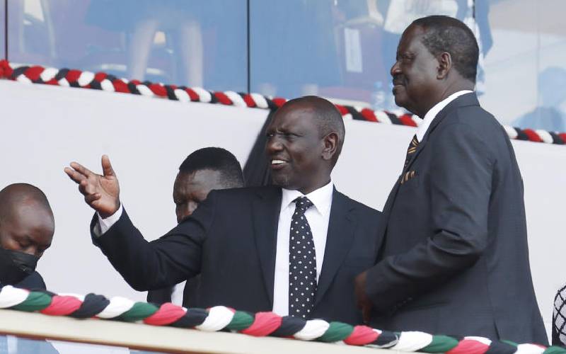 DP William Ruto and ODM leader Raila Odinga during during the funeral service of Mwai Kibaki , April 29, 2022. [Stafford Ondego, Standard]