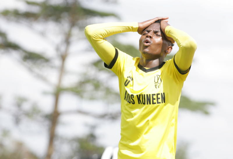 Wazito FC's James Kinyanjui reacts after missing a goal against Homeboyz FC during a FKF Premier League match at Utalii Sports Club on October 17, 2021. [Jonah Onyango, Standard