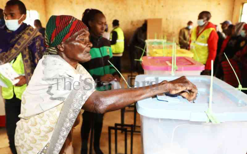 Kikuyu Mbivo, 80, votes at Migwani AIC Primary School in Mwingi West, Kitui County on August 9, 2022. [Paul Mutua, Standard]