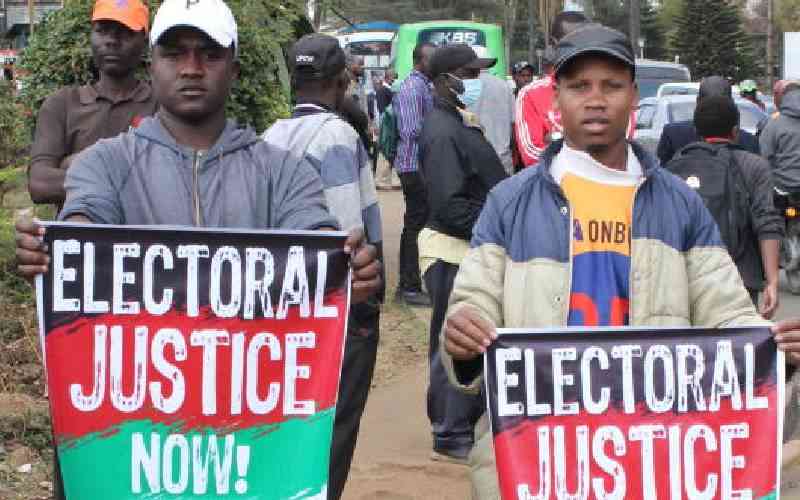 Azimio supporters carry placards outside Milimani court buildings when Presidential candidate Raila Odinga filed a petition challenging the win of Kenya Kwanza Presidential candidate William Ruto as the President-elect. [Collins Kweyu, Standard]
