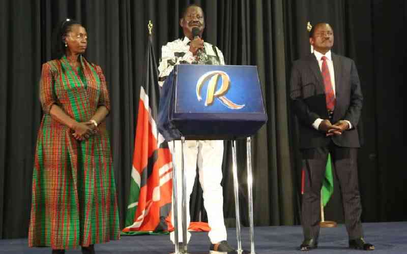 Azimio presidential candidate Raila Odinga flanked by Martha Karua [left] and Kalonzo Musyoka [Right] at the KICC after filling the presidential election petition seeking to nullify the results on August 22, 2022. [Silas Otieno, Standard]