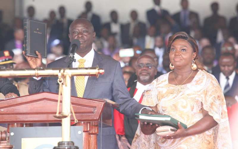 Deputy President-elect Rigathi Gachagua takes the oath of office as his wife Dorcas Rigathi holds the constitution at Kasarani Stadium on September 13, 2022. [Denish Ochieng, Standard]