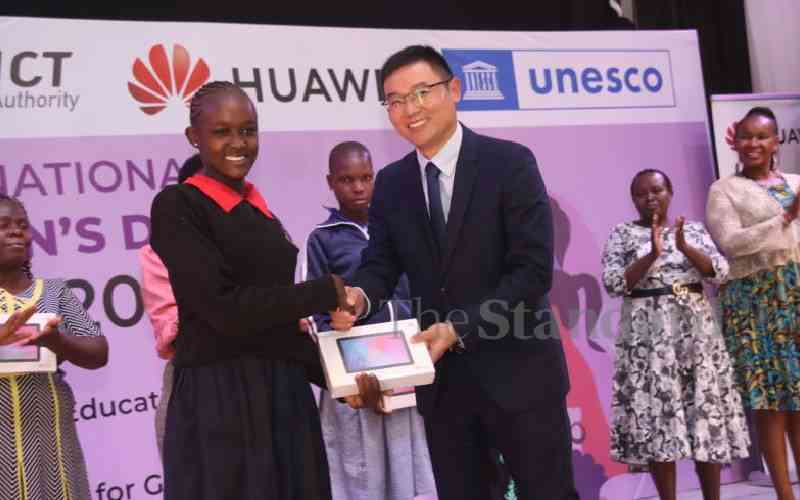 Huawei Kenya Deputy CEO Steven Zhang awards Pangani Special School's Mary Wanjiru during International Women's Day celebrations at the Kenya Institute of Special Education on March 8, 2023. [David Gichuru, Standard]