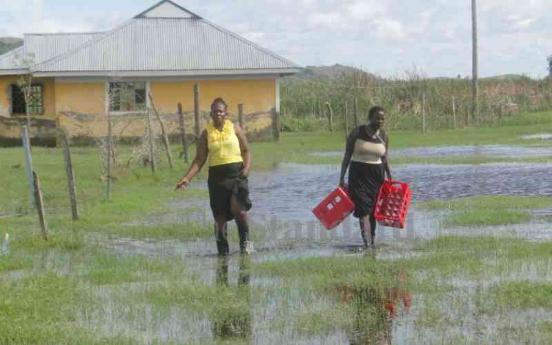 Women wading through flooded farmlands in Got Agulu, Bondo. [Isaiah Gwengi, Standard]
