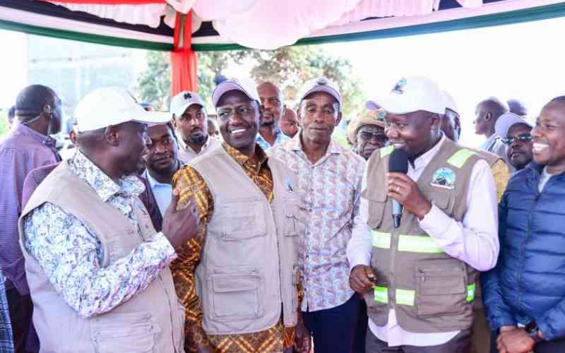 KeRRA Director Philemon (second right) explains a point to President William Ruto, DP Rigathi Gachagua and other leaders at Ribaroli Market, Kiambaa, Kiambu County on April 15, 2023. [PSCU, Standard]
