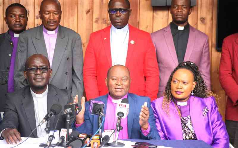 L-R: Bishop Hudson Ndenda, Bishop Dr Robert Mutemi, and Bishop Dr Elizabeth Thuiya speaking at a press briefing in Nairobi on Tuesday, May 9 on the gazettement of the presidential task force on the review of the legal and regulatory framework governing religious organizations in Kenya. [Wilberforce Okwiri, Standard]