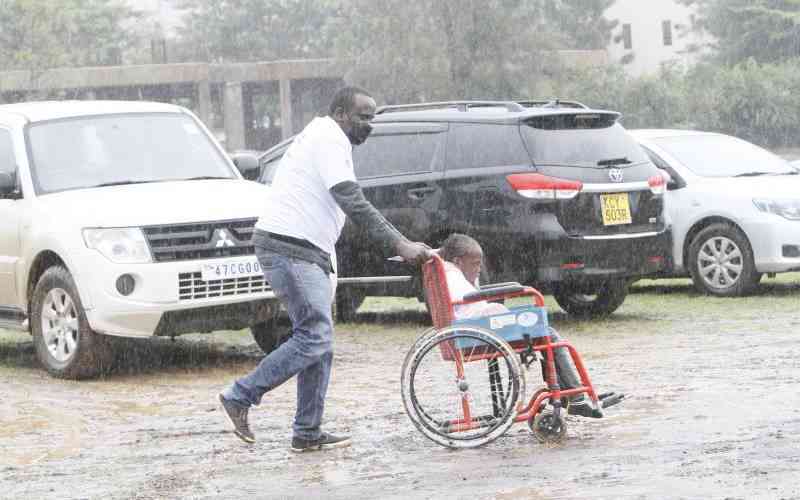 Despite the heavy rains experienced in Nairobi, a care giver braved the downpour with the child to attend International Day for Persons with Disability celebration at Kasarani Primary School, on February 12, 2021. [Jenipher Wachie, Standard]