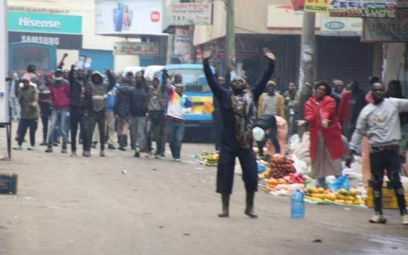 Traders who were going about with their business along Luthuli avenue in Nairobi plead with police not to lob teargas at them during the Azimio la Umoja protests against the high cost of living. [Denis Kibuchi, Standard]