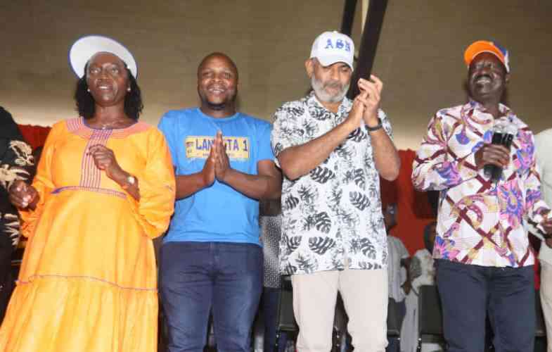 Azimio leader Raila Odinga (right), deputy leader Martha Karua (left), Mombasa Governor Abdulswamad Nassir and Felix Odiwour address supporters in Mombasa recently. [Omondi Onyango, Standard]