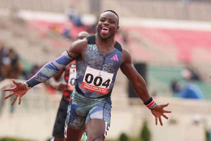 Ferdinand Omanyala celebrates winning the 100M men final race during the Trials for World Athletics Championship held at Nyayo National stadium in Nairobi on July 08, 2023.[Stafford Ondego, Standard]