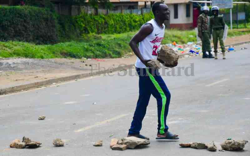Anti-riot police look on as a demonstrator erects a barricade at a road in Nyalenda, Kisumu, during Azimio protests on July 21, 2023. [Michael Mute, Standard]