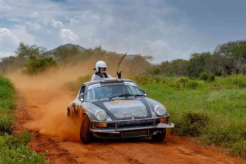 Evgeny Kireev of Cyprus a top his Porsche 911 at the ongoing 2023 East African Safari Classic Rally. [Jonah Onyango, Standard]