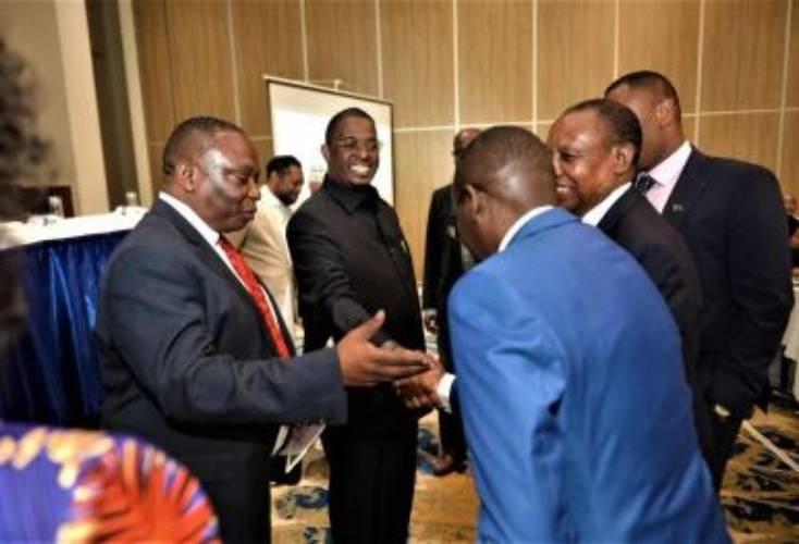 East Africa Chamber of Commerce, Industry and Agriculture President Richard Ngatia (left) introduces his board to the Zanzibar Minister for Trade and Industry Development Said Shaaban during the board's meeting in Zanzibar last weekend. [George Orido, Standard]