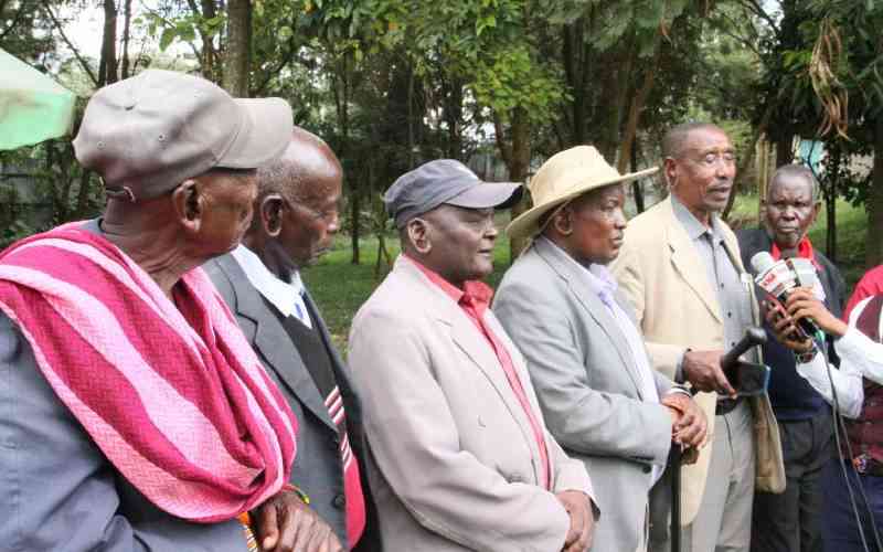 A section of the Maasai Council of Elders led by National chairman Kelena Ole Nchoe address the media in Narok County on May 20, 2024. [George Sayagie, Standard]