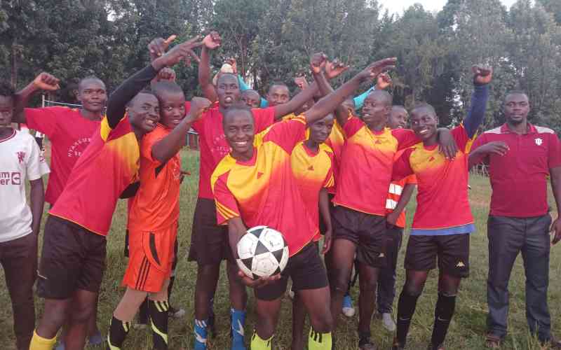 Nyakembene High School boys celebrate their victory after they defeated Marongo High school 1-0 to make a come back after six years in the cold. [Osinde Obare,Standard]