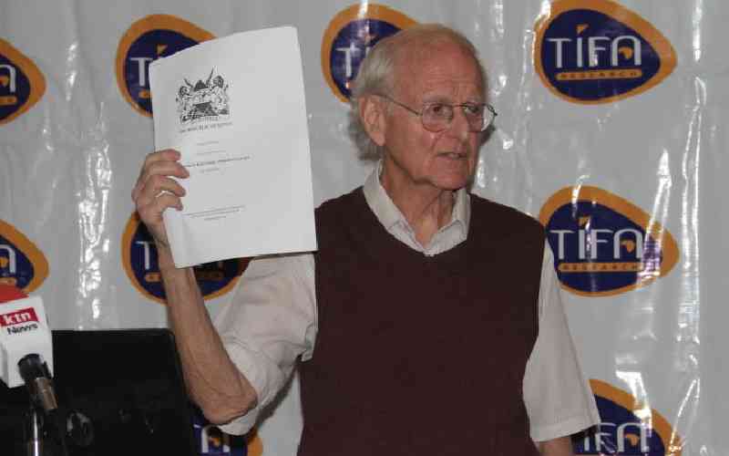 Research analyst Dr Tom Wolf explaining the released TIFA opinion polls which saw Raila as the lead on July 29, 2022, in Nairobi. [Esther Jeruto, Standard]