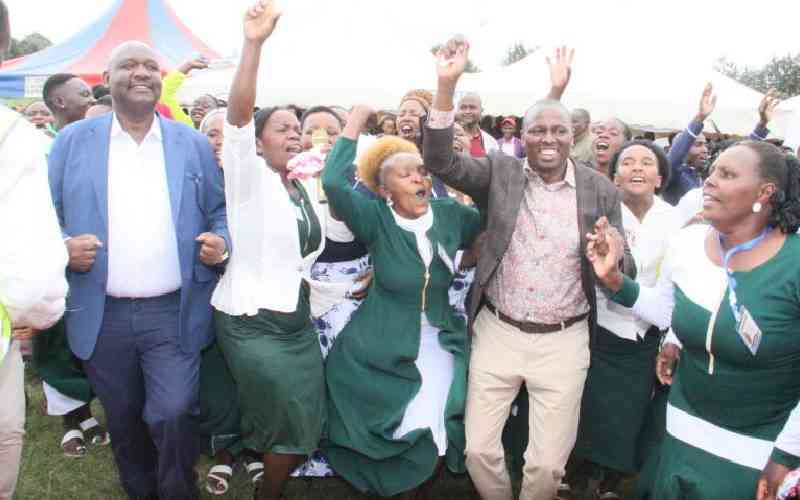 National Assembly Majority leader Kimani Ichung'wah (centre) dances during a church service in Nairagie Enkare, Narok East. [File, Standard]