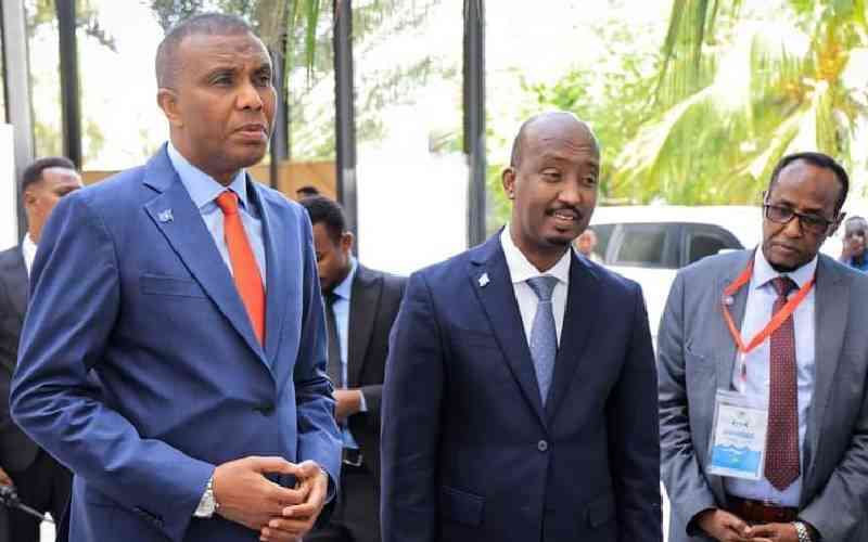 Somalia's Prime Minister Hamza Abdi Barre and Minister of Fisheries and Blue Economy Ahmed Hassan Adan during the inauguration of the Fisheries Week on July 4, 2024. [Courtesy, OPM, X]