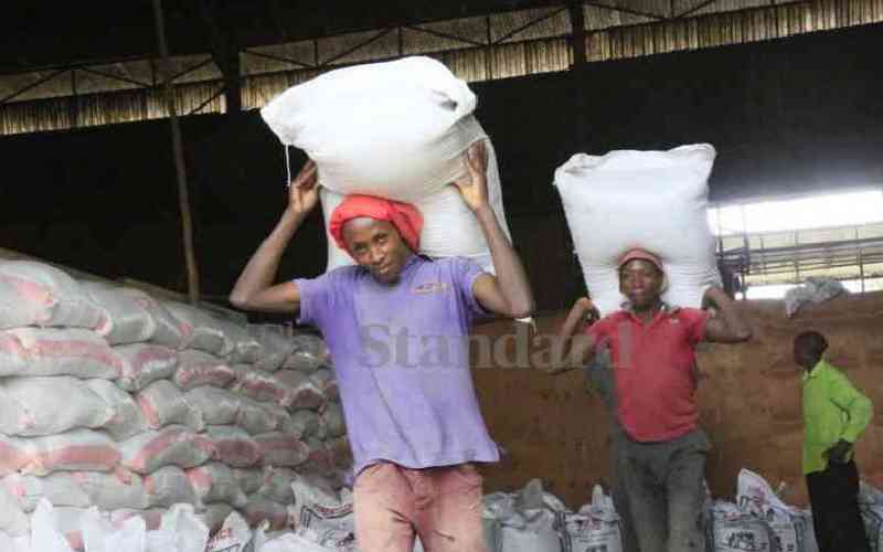 Workers load bags of fertiliser into a lorry at Kiganjo National Cereals and Produce Board depot in Nyeri County in April. [Kibata Kihu, Stanadard]