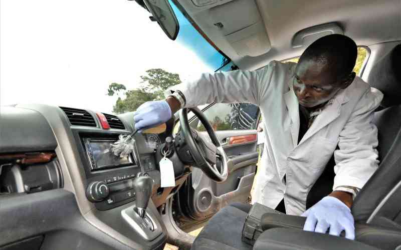 Scene of crime officer dusts inside a car that was involved in a previous carjacking incident. [File, Standard]
