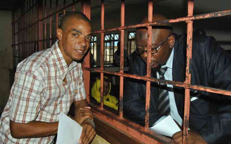 Terror suspect Jermaine Grant confers with his lawyer Chacha Mwita during the hearing of his case where he is facing terrorism charges at Shanzu Law Courts in Mombasa County on February 17, 2015. [File, Standard]