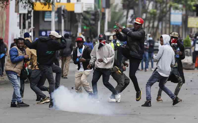Protestors react to a tear-gas canister thrown to them by Kenyan anti-riot police during Nane Nane demonstration in Nairobi on August 8, 2024. [AFP]