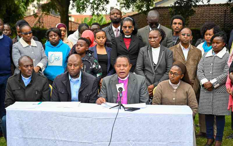 NCCK Rev Dennis Nthenge, SUPKEM Salim Inrahim,Evangelical Alliance in Kenya Bishop John Kamau Warari, KCCB Sister Mary Sebastian Waweru address the press on the Multi-faith Leaders Consultation on Climate Adaptation and Agriculture Finance in Kenya on April 19, 2024. [Robert Tomno, Standard]