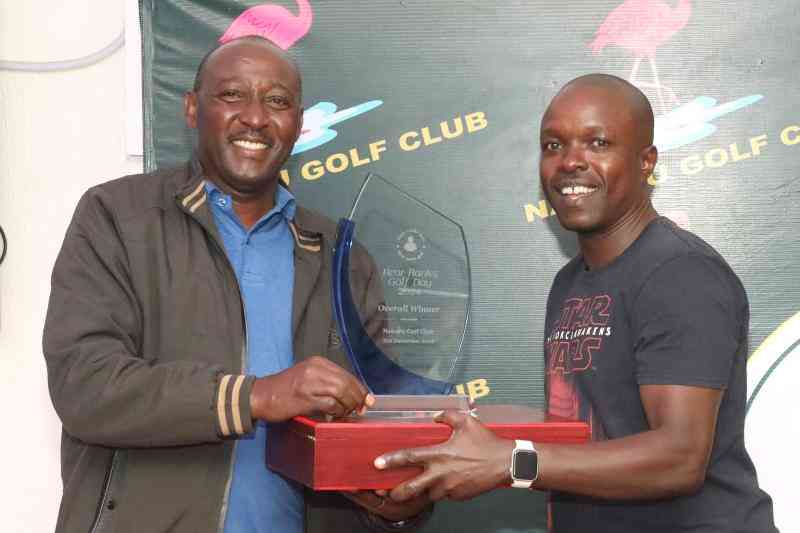 National Defense University of Kenya (NDU) DVC Major-General Thomas Njoroge Ng'ang'a (left) presents the Rear Ranks overall title to Njoroge Wanja (right) at Nakuru Golf Club, December 21, 2024. [Mose Sammy, Standard]
