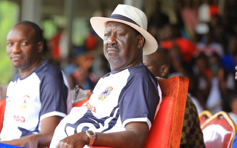 ODM Leader Raila Odinga at Gusii stadium during the unveiling of Shabana FC new kit by their sponsor Sportpesa. Kisii Governor Simba Arati ,his Nairobi and Migori counterpart Johnson Sakaja and Ochillo Ayako were in attendance.[Sammy Omingo, Standard]