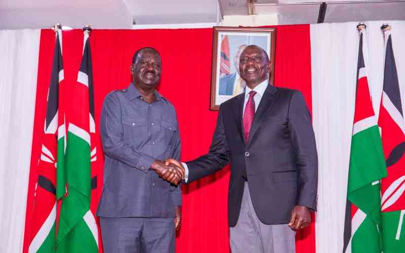 President William Ruto of UDA and Rt. Hon. Raila Odinga of ODM sing a agreement to work together at KICC. [Emmanuel Wanson]