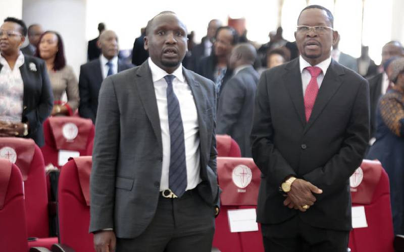 Senate Majority Leader Aaron Cheruiyot and Minority Leader Stewart Madzayo at AIC Church Milimani in Nairobi on February 27, 2025. [Boniface Okendo, Standard]