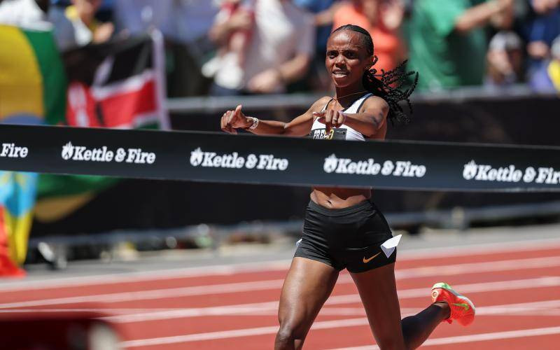 Double Olympic champion Beatrice Chebet celebrates after breaking the 5000m world record at the Eugene Diamond League meeting on July 5. [Courtesy, Diamond League]