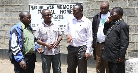 Family members of the late Mark Marigi (INSET) gather outside the Nakuru War Memorial Funeral Home waiting for conclusion of their son’s postmortem who died at Kivu Resort on Sunday, [PHOTO: BONIFACE THUKU/STANDARD]