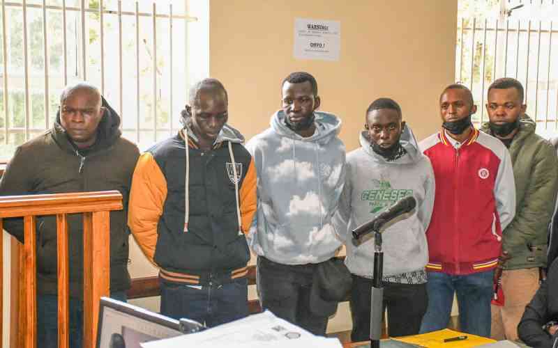 Six Kenya Wildlife Service rangers linked to the disappearance of fisherman Brian Odhiambo, when they appeared before Principal Magistrate Kipkurui Kibelion at the Nakuru Law Courts on May 5, 2025. [Kipsang Joseph, Standard