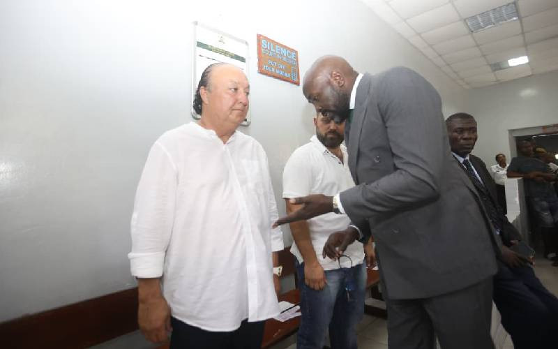 Turkish billionaire Osman Elsek, Gokmen Sandikci and lawyer Cliff Ombeta at the Mombasa Law Courts on January 27, 2026. [Kelvin Karani, Standard]
