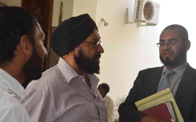 Joginder Singh Dhanjal (centre) consults his lawyer Khalid Salim at the Mombasa law courts in Mombasa County. [Kelvin Karani, Standard]
