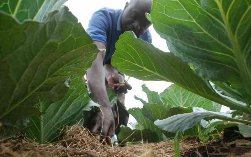 A farm attendant doing mulching at a cabbage farm in Kisumu county. [Denish Ochieng, Standard]