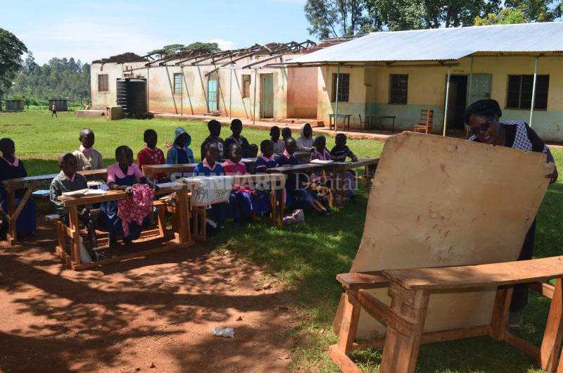 Some of the pupils of Gambogi Primary School are learning under trees while others share a classroom after winds ripped off the roofs of Standard Four, Six, Seven, and Eight classrooms, the staff room, the administration office and the library in August last year during heavy rains.
