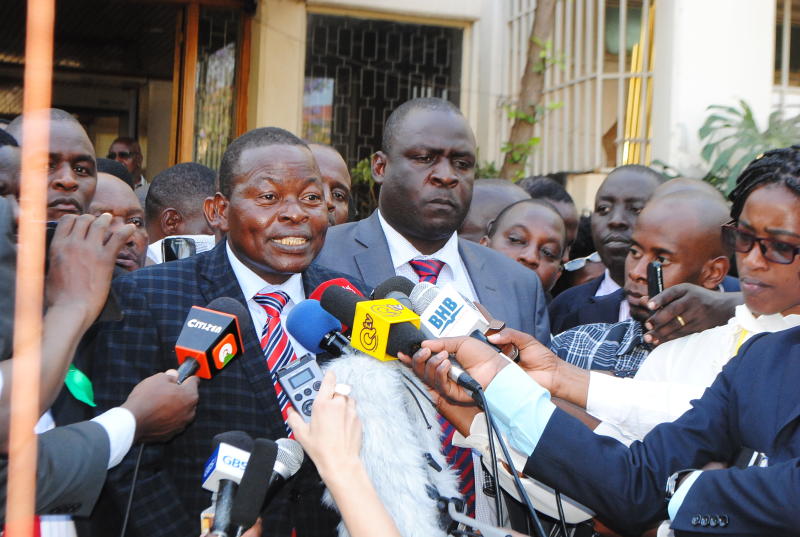 Kuppet secretary general Akelo Misori and Chairman Omboko Milemba address the press in Nairobi. [File, Standard]