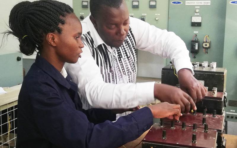 Peter Maina, heavy current machines technology instructs Nyaboke at the Engineering workshop. [Courtesy]