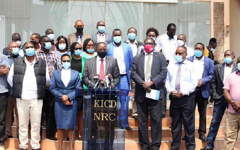 National Parents Association Chairperson Nicholas Maiyo (centre) addressed the press during a parental empowerment and engagement forum on the competency-based curriculum (CBC). [Wilberforce Okwiri, Standard]
