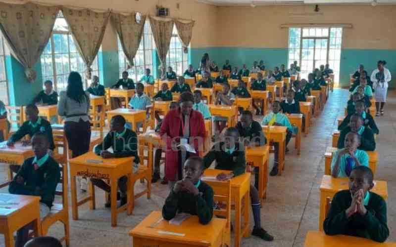 Nyeri Primary School's Kenya Certificate of Primary Education (KCPE) candidates participate in a rehearsal session on Friday. The KCPE examination is set to commence on Monday. [Amos Kiarie, Standard]