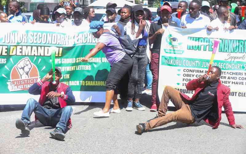 Junior Secondary school teachers in Nakuru on a peaceful demonstration in Nakuru City on May 13, 2024, urging the government to employ them under permanent terms. [Kipsang Joseph, Standard]