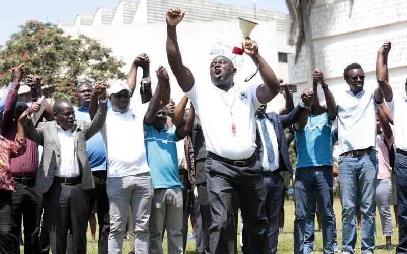 Universities Staff Unions members and UoN lecturers during the start of their strike at the UoN Nairobi campus on September 17, 2025 accusing the Government for not honouring their agreed CBA.[Boniface Okendo, Standard]